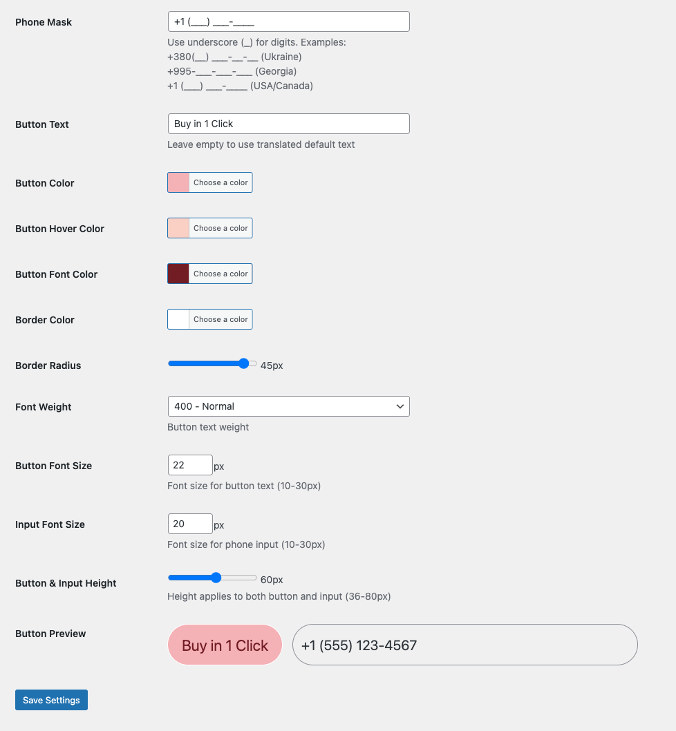 The plugin includes a powerful admin settings panel with live previews, giving store owners full control over button appearance and input styling — no coding required.