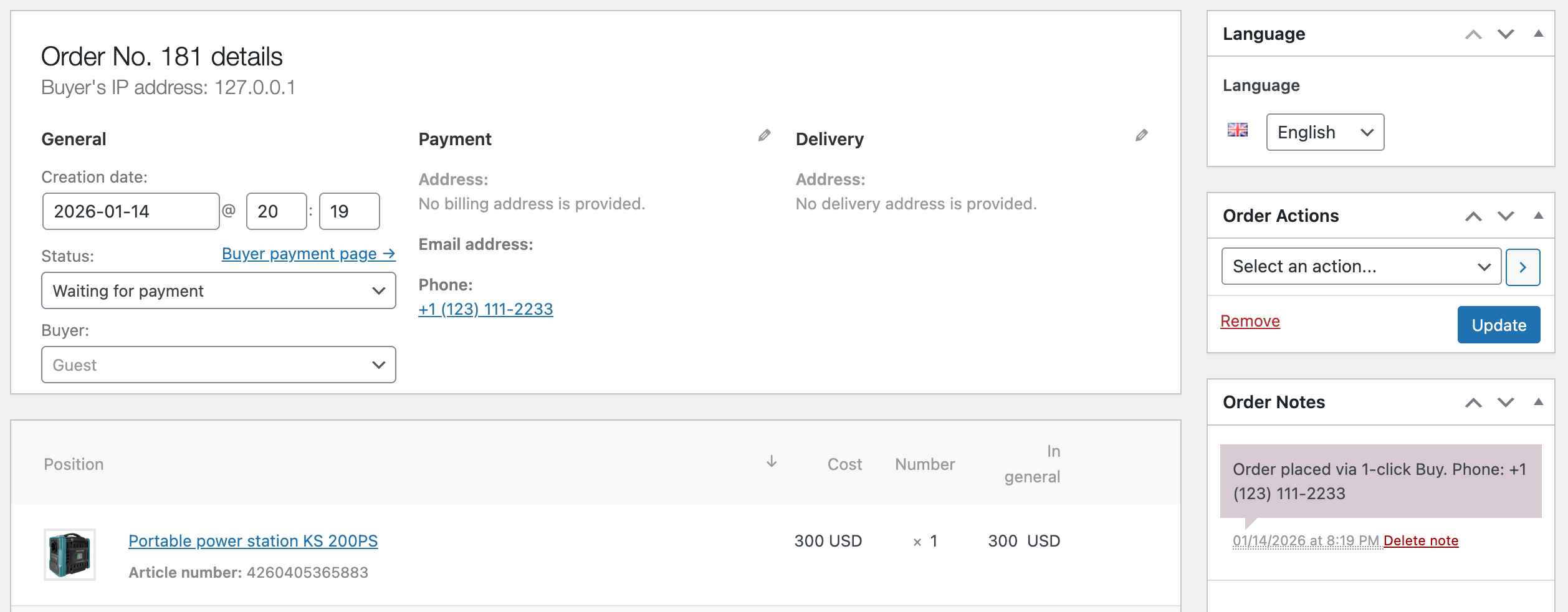 * Order notes include a clear description: "Order placed via Buy in 1 Click. Phone: [customer number]".